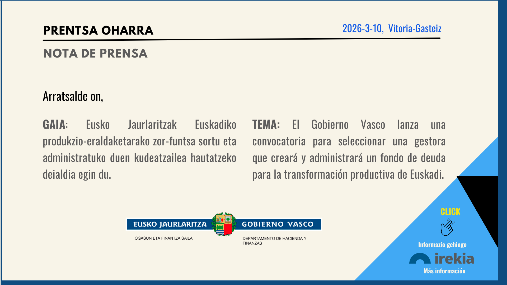 Eusko Jaurlaritzak, Euskal Finantza Erakundearen (EFE/IVF) eta haren sozietate publiko INDARTUZ Kapitala S.A.ren bidez, deialdi bat abiatu du Euskadiko ekoizpen-eraldaketa bultzatzera bideratutako zor-funts bat sortu eta kudeatuko duen funts-kudeatzaile bat hautatzeko.
